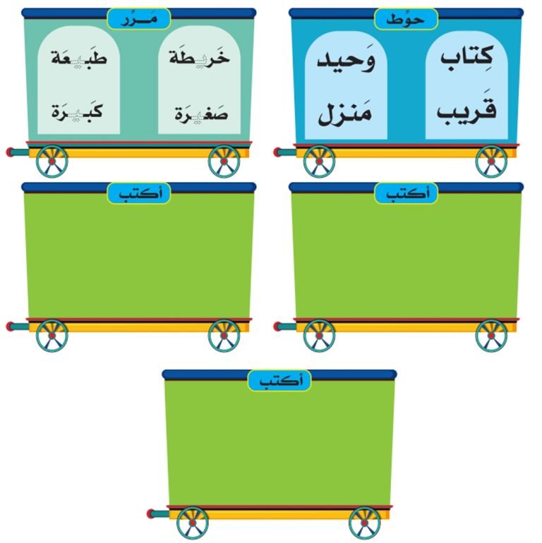 وسيلة تفاعلية لترسيخ مهارة المدود بحروفه الثالثة (الالف والواو والياء) وضع كل منها بمغلف منفصل يحتوي على قطار وأربعة مقطورات